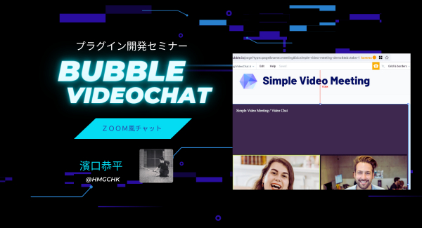 イベントはハンズオンスタイルで、濱口氏自身が開発を手がけ公開したという「Bubble」のプラグイン「Video Meeting」を使った“「Zoom」風ビデオチャット”を作成する方法を参加者・視聴者と共有します。