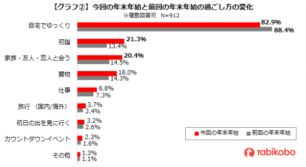 今回と前回の年末年始の過ごし方の比較では、「自宅でゆっくり」が5.5ポイント減少し、「初詣」が7.9ポイント、「家族・友人・恋人と会う」が5.9ポイント、「買物」が3.7ポイント、「旅行」が1.3ポイント増加しました。※グラフ(2)参照