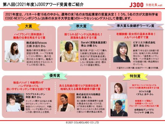 国内最大級の女性経営者データベースサイトを運営する女性社長.net((株)コラボラボ企画・運営 本社:東京都千代田区 代表取締役:横田響子)は、全国の個性あふれる女性起業家を表彰する「J300アワード」受賞者を発表しました。J300アワード受賞者7名のうち5名が、2021年2月開催お茶の水女子大学主催シンポジウムのトークセッションゲストとして登壇し事業発表を行います。シンポジウムの詳細は近日公開予定です。