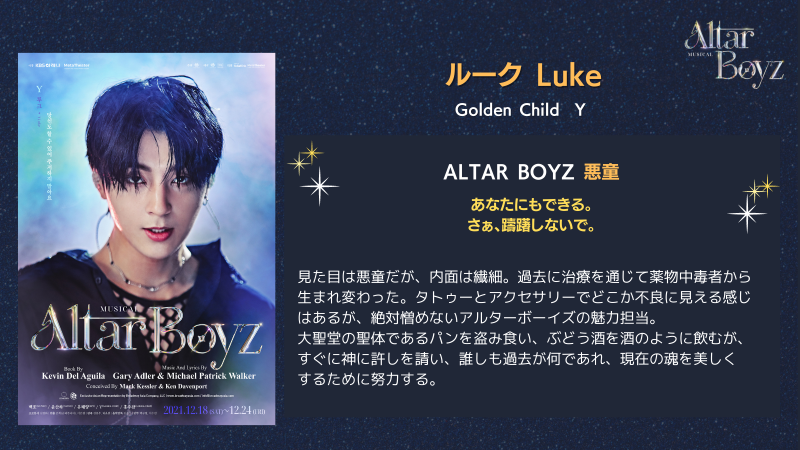 ミュージカル『ALTARBOYZ』はK-POPアイドルとして初のオフ・ブロードウィミュージカルの演出を担当するSUPERJUNIORウニョクをはじめ、グローバルK-POPスター NU’EST ベクホ|ASTRO ユンサナ|SF9 ユ・テヤン|Golden Child Y(ワイ)&ホン・ジュチャンによる「歴代級キャスティング」として日々高まる関心の中、先日公式SNSにてキャラクター別ポスターを公開。其々5人のメンバーが「頼もしく」、「優しく」、「セクシー」で「かわいい」、また「眩し過ぎるビジュアルと眼差し」を見事に表現。まるで実在するアルアイドルグループのような彼らは、歌と踊りで観客に愛と慰めを伝える『ALTARBOYZ』として、ステージに立つ。