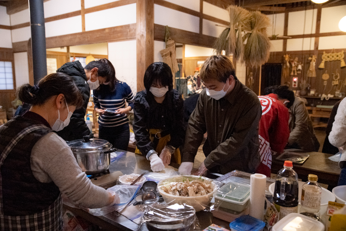 作り方を教わる中で、「だまこ汁は良く食べる家庭料理なのですか?きりたんぽとの違いは?」との参加者からの質問に対し、地元の方から「きりたんぽは米をつぶしてから焼く手間がかかる。だまこは米をつぶして丸めるだけなので、より手軽な家庭料理。具材も各家庭によって違います」と答えていただくなど、会話を交わし、交流を深めることが出来ました。