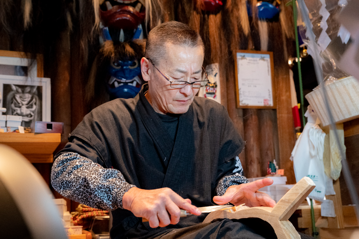 ツアー前半は、『祭り留学』第一弾、第二弾のオンラインツアーで紹介した内容を、再び現地で体験するコンテンツからスタート。「なまはげ館」では、第一弾のオンラインツアーで解説員を務めた太田氏から、なまはげの歴史について解説いただいたほか、なまはげ面の彫師である石川千秋氏の制作の様子を見学しました。