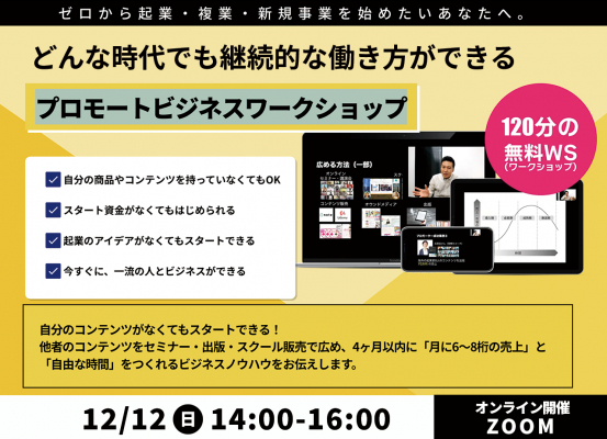 そこで、現役プロモーターが、短期間で圧倒的な成果が出せるプロモートビジネスの全体像から具体的な数字までを、120分間の無料ワークショップで解説します。