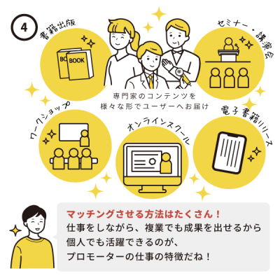 プロモーターという働き方をスタートする方法やノウハウの活かし方をお伝えするので、プロモートビジネスを知らない方はもちろん、聞いたことはあるけれど実際に仕事としてスタートする方法は知らない方にも、学んでいただく価値のある内容です。