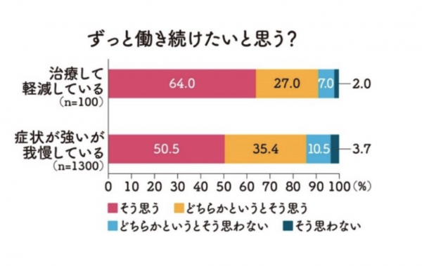 「治療して症状が軽減している」人は、「症状が強いのに治療せず我慢している」人よりも「ずっと働き続けたい」という意欲が高いことがわかりました(下図)。