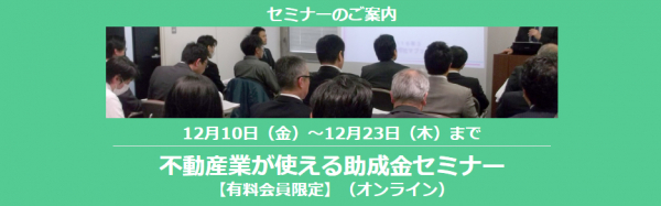 「不動産業が使える助成金セミナー(オンライン) 2021年冬版」を、12月10日(金)~12月23日(木)まで期間限定でお届けいたします。