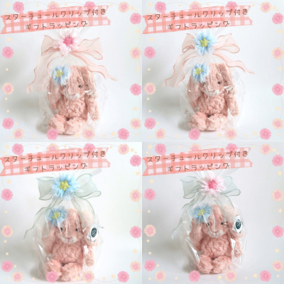 ラッピングの最大の特徴は、ぬいぐるみとリボンを留めるために使用しているスターチュールヘアクリップです。このヘアクリップは1つずつハンドメイドで仕上げています。最初はヘアクリップがない状態のラッピングをしていましたが、商品を受け取る人が少しでも喜んでもらえるようにヘアクリップをつけるようにしてみました。