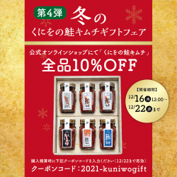 「冬のくにをの鮭キムチギフトフェア」を開催。 今回の第4弾は12/16(木)12:00PM~12/22(水)まで公式オンラインショップで、くにをの鮭キムチシリーズ全品を10%OFF(税別、送料別)にて販売いたします。