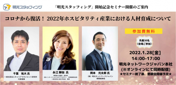 人材派遣サービス「明光スタッフィング」を展開する株式会社明光ネットワークジャパン(東京都新宿区、代表取締役社長:山下 一仁、以下、明光ネットワークジャパン)は、2022年1月28日(金)に、無料オンラインセミナー「コロナから復活! 2022年ホスピタリティ産業の最新事情と人材育成について」を開催いたします。