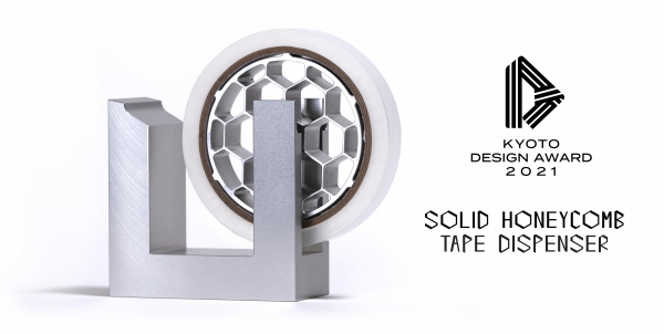 ソリッドハニカムテープカッターは、精密切削技術の粋を集めて製作した最高級のアルミ製デザイン文具です。本体と刃とテープホルダーを同一アルミ素材で構成した機能美と、京都の伝統色を表したアルマイト加工仕上げが認められ、京都デザイン賞2021に入選しました。蜂の巣の六角形の構造は、西洋ではハニカム、日本では亀甲と呼ばれ吉祥文様として用いられてきました。ソリッドハニカムシリーズとしてはラウンドテーブル(京都デザイン賞2020京都府知事賞)に続き2年連続の受賞となります。京都の伝統と文化を守りながら、町工場のアルミ素材と技術への挑戦から誕生した製品として期待されています。