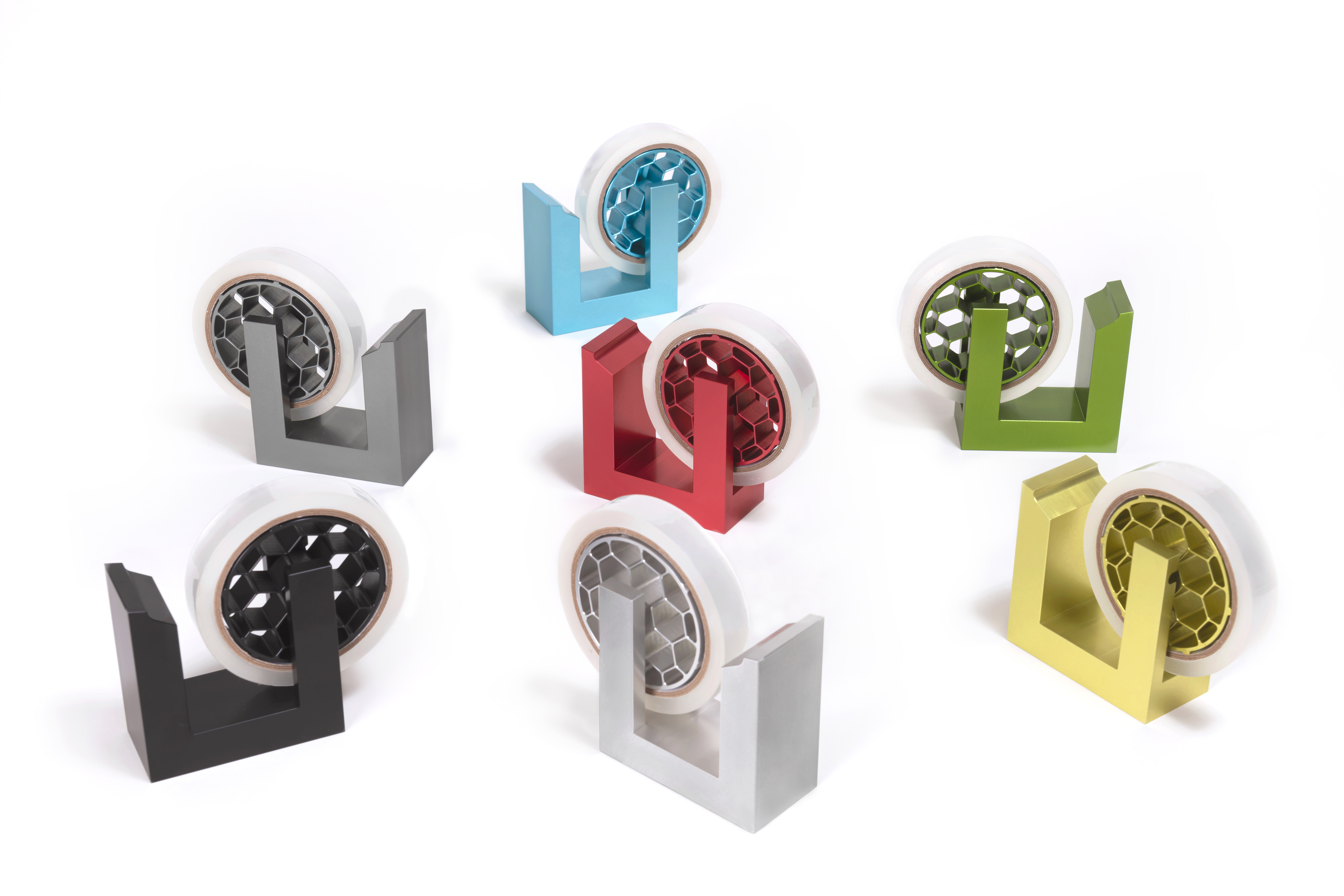 従来のテープカッターはABS樹脂やスチール製の本体にセメントの重りを入れ、金属製の刃を付けて使うものが大半です。しかしコアマシナリーではオープンイノベーションにより、素材の重さと質を活かした新製品をATELIER OPA+鈴木敏彦と協同で開発しました。本体はまるごとアルミ総削りで構成し、端部に微細な凹凸を施して刃を仕上げました。テープホルダーにはハニカム状の穴を切削し、回転しやすい軽さを実現しました。アルマイト加工によって京都の7つの伝統色(銀色、利休鼠、黒、水色、鸚鵡緑、たんぽぽ