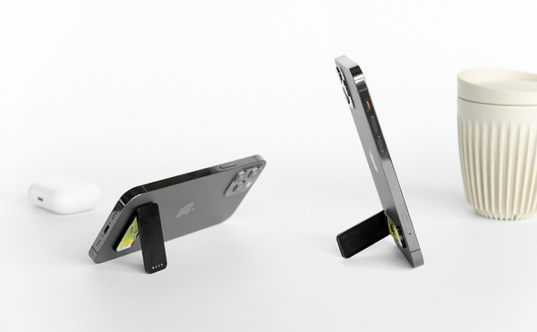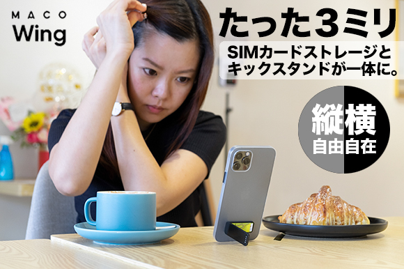 Maco Wingは、たった3ミリ厚の超薄型、堅牢なステンレス製、縦も横も自由に設置可能なキックスタンドとSIMカード専用ストレージが一体になったスマートフォンスタンドです。Maco Wingを使えばもうSIMカードの保管に困ることがなく、紛失の心配も探す苦労もありません。SIMカードリリースピンも一緒に安全に保管できます。ほとんどのスマートフォンとケースに対応、付けていることを忘れるほど薄く頑丈で、6.7インチの大型スマートフォンまで角度60度に縦に立てて安定して使えるほか、水にも強い防水仕様、ワイヤレス充電も妨げないミニマムサイズが特長です。