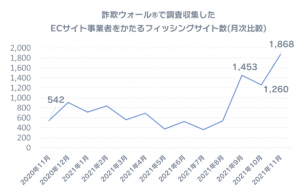 BBソフトサービス株式会社が開発・提供する、ネット詐欺専用セキュリティソフトの詐欺ウォールで調査として収集しているECサイト事業者をかたるフィッシング詐欺サイト数は、2021年9月の1,453件から10月は1,260件と減少したものの、2021年11月は1,868件と前月比1.5倍まで増加しました。