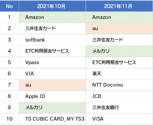 詐欺ウォールで収集したフィッシング詐欺サイトで盗用されていたブランドの上位10位は以下の結果となり、ECサイト事業者をかたるフィッシングサイトでは先月同様Amazonがトップを継続しております。Amazonは前月比126%まで増加、さらに全フィッシングサイトの約26%を占め、またメルカリも前月比274%と増加する結果となりました。