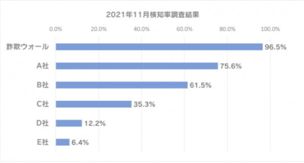 詐欺ウォールを開発・提供するBBソフトサービスでは、公的機関等との連携により収集した詐欺サイトURLを利用し、定期的に詐欺サイトの検知率調査を行っています。2021年11月の詐欺ウォールによる詐欺サイト検知率は96.5%と他社と比較し高い結果となりました。