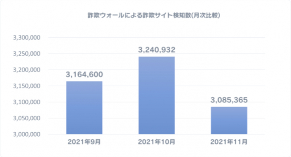 2021年11月に詐欺ウォールによる詐欺サイト検知数は3,085,365件となり、前月と比較すると155,567件減少する結果となりました。※