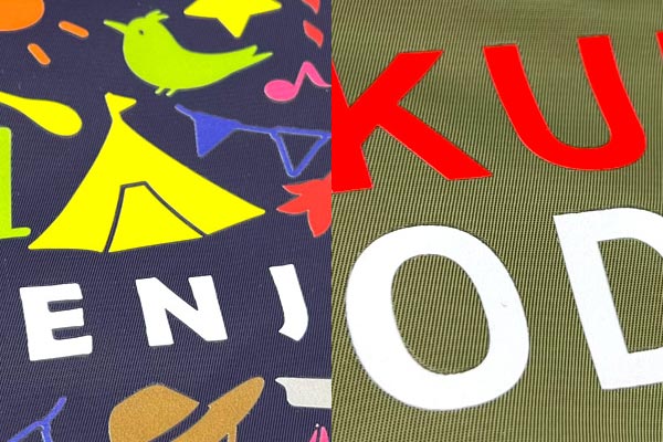 一般的な転写プリントのような光沢を抑え、周囲の縁取りもなく、生地になじんだマットな風合いでフルカラープリントできる「オンデマンド転写」と、単色でのプリントや大ロットの注文にもおすすめな「シルクスクリーン」の2つの加工方法でプリントが可能です。作成したいイメージや用途に合わせてお好きな加工方法をご選択下さい。
