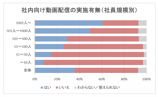 社内への動画配信については、企業規模が大きいほど実施率が高いという結果が出ました。