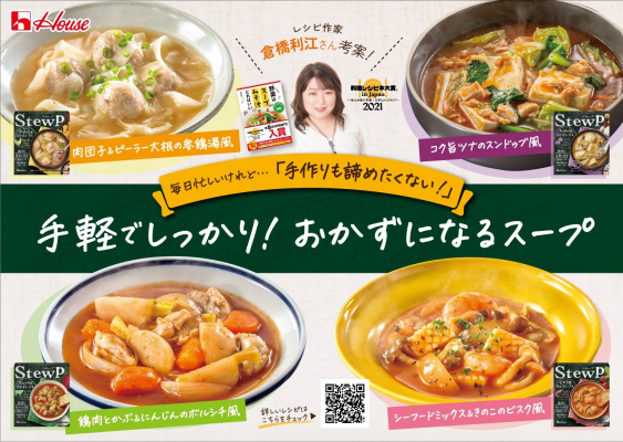 昨年発売されたビスク風おかずスープの素、参鶏湯風おかずスープの素に加え、スンドゥブ風おかずスープの素、ボルシチ風おかずスープの素も新登場。倉橋利江さんが考案した全4点のアレンジレシピが、ハウス食品特集レシピページ(https://housefoods.jp/recipe/special/stewp_tie_up/)にて公開されます(2/14公開予定)。