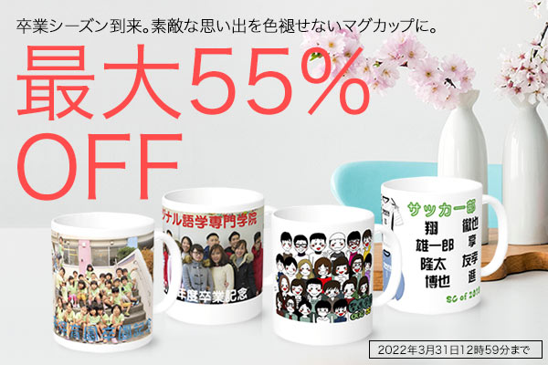 記念品や販促品の定番アイテムとしてオリジナルプリント.jpで大人気のマグカップを、今年も最大55%OFFでご提供いたします!1周ぐるりとフルカラーでプリントできるオリジナルマグカップは、写真やメッセージを入れた卒業・卒園記念、チームの卒団記念や退職される方へのプレゼントに最適です。もちろん、会社のノベルティや販促品として、また自身のショップなどで販売するオリジナルグッズなどとしてもおすすめです。また、マグカップは10点からご注文いただけます。最短3営業日で出荷できるのも嬉しいポイントです。是非、このお得な機会にオリジナルのマグカップを作成してみてはいかがでしょうか?