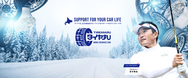 タイヤ丸ではイメージキャラクターとして、車好きで知られるプロゴルファーの宮本勝昌氏を起用しております。 特にタイヤ選びにはこだわりを持たれている宮本氏も、充実の販売&サポート体制が魅力です。
