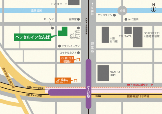 大阪メトロ御堂筋線「なんば駅」25番出口から徒歩2分、大阪市の中心市街地である「道頓堀」エリアに位置しております。JR新大阪駅までは乗り換えなしでアクセスでき、観光・ビジネスのどちらにもご利用いただける大変便利なロケーションとなっております。また、戎橋や食い倒れで有名な道頓堀商店街へも至近で、大阪観光の拠点としてもご利用いただけます。