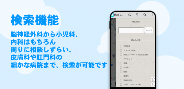 マップ上のピンで近くの病院がひと目で分かるため、直感的に使えます。