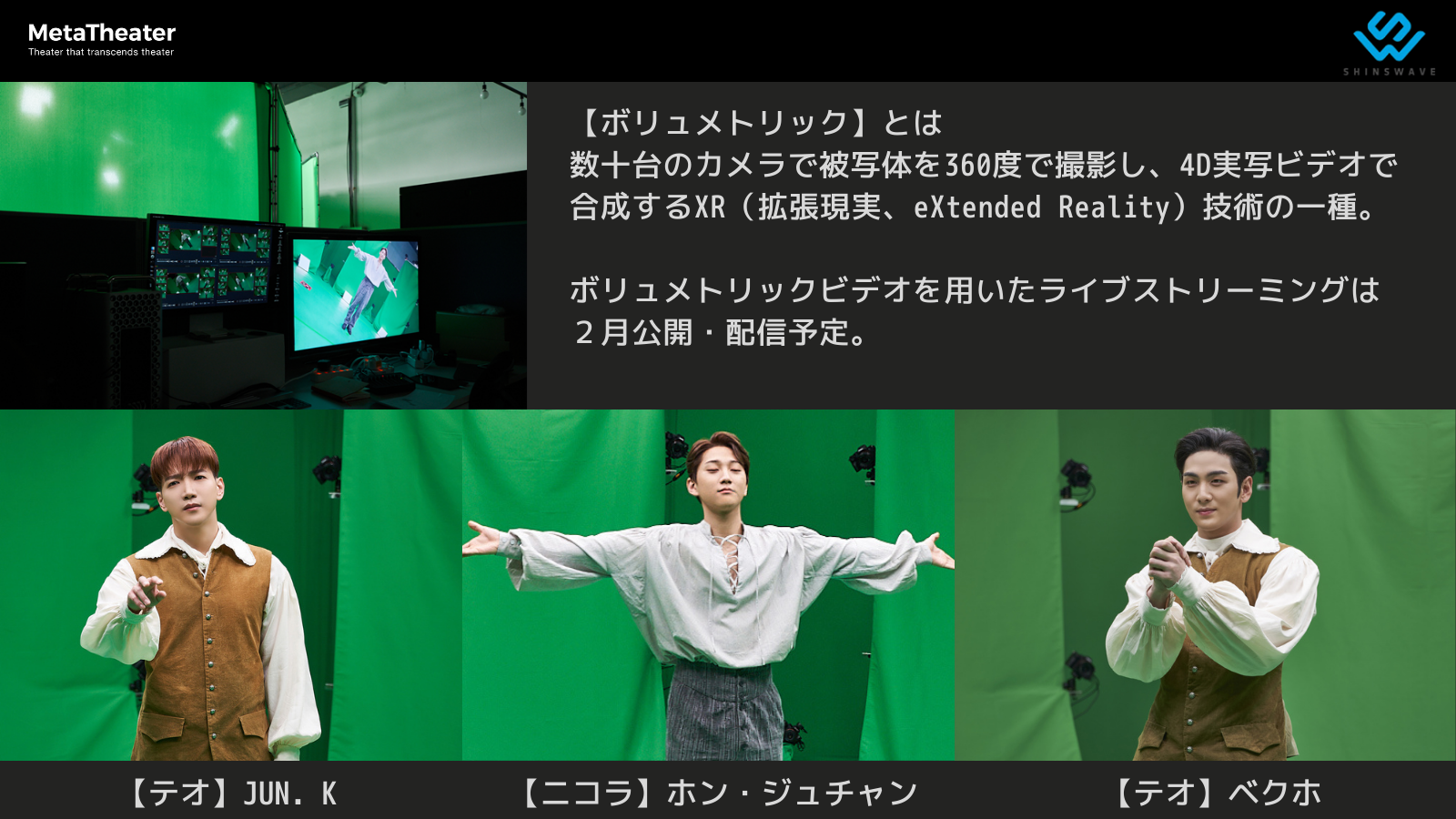 【ボリュメトリック】とは数十台のカメラで被写体を360度で撮影し、4D実写ビデオで合成するXR(拡張現実、eXtended Reality)技術の一種で、2020年10月SUPERJUNIORオンラインコンサートに登場した「ジャイアントシウォン」をはじめコンサートやショー、広告などで披露されたが、ミュージカルライブストリーミングに導入したのは今回が初めてである。