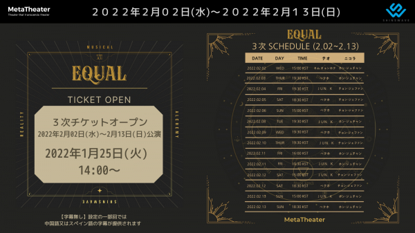 ミュージカル『EQUAL』は本日1月25日(火)14時よりメタシアターにて2月2日(水)から2月13日(日)までの公演チケットが販売される。また、日本語、英語字幕以外にも中国語、スペイン語字幕も一部配信される。詳細はメタシアターHP・公式SNSで確認することができる。