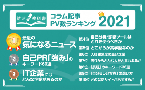 新卒学生向けの就活情報サイト「就活の教科書」を運営する株式会社Synergy Career(本社:大阪府大阪市、代表取締役社長:岡本 恵典)は、「就活の教科書」に掲載している記事の年間PV数ランキングトップ10を発表。面接で聞かれる質問事項や、自己PRで使えるキーワード、いま人気のIT業界についてなど、就職活動に役立つ情報を発信するコラム記事のアクセス数から、就活生の関心や悩みを分析し、2021年の就活事情を紐解きます。