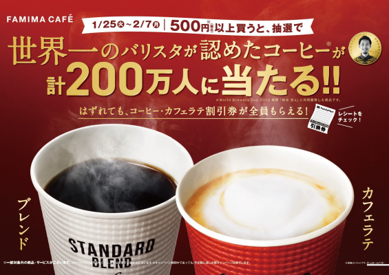 500円(税込)以上購入で、ブレンドSまたはカフェラテMが抽選で計200万人に当たる大型施策を展開いたします。はずれても「FAMIMA CAFÉ」のコーヒーに使用できる20円割引券が全員に当たります。