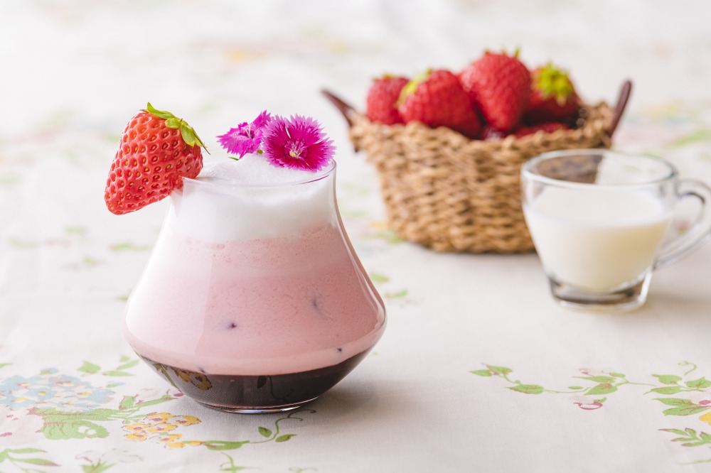 甘酸っぱい苺とミックスベリーのピューレにヨーグルトとミルクを合わせ、ふわふわにスチームしたミルクフォームを乗せました。口当たりはミルキーでありながら、後味はさっぱりとしており、春のさわやかな心地よさを感じられます。トップにフレッシュの苺とエディブルフラワーを飾った、見た目も華やかな「ストロベリー&桜 アフタヌーンティー」限定のノンアルコールカクテルです。