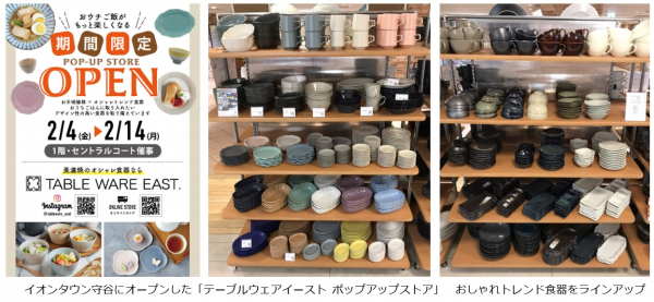 美濃焼を中心にそろえた食器通販サイト「テーブルウェアイースト」(https://www.t-east.jp/)を運営する株式会社あづま商店(本社:岐阜県土岐市、代表取締役社長:東 隆之)は、イオンタウン守谷(茨城県守谷市)に、2022年2月4日(金)~2022年2月14日(月)の期間でポップアップストアをオープンしました。
