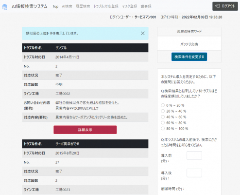 本システムは、AIを用いて過去のドキュメントを機械学習することで、検索キーワードに「意味的に近い」過去の類似のドキュメントを検索し、類似度の高い順に結果表示することが可能です。