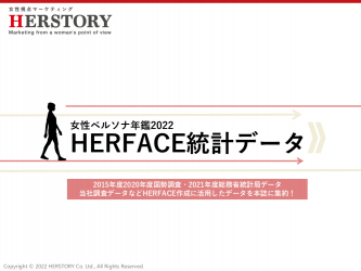 女性視点マーケティング(R)を行っている株式会社ハー・ストーリィ(代表取締役:日野佳恵子、本社:東京都港区)は、女性の人口・雇用・就労状況・買物行動・生活変化などに関する統計&調査データを1冊にまとめた『女性ペルソナ年鑑2022「HERFACE統計データ」』を2022年1月31日(月)より販売開始いたしました。