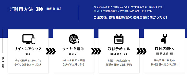また、取付店と提携しているのもタイヤ丸の大きな特徴です。購入後の取付は購入時に予約した日にお近くの提携取付店に向かうだけ! タイヤの運搬や取付店への作業予約などを別途行う必要がなく、取付までのご負担を極限までカットしています。