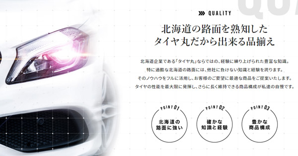 タイヤ丸を運営する『株式会社 海』は、北海道を拠点に車関連業に30年以上携わる、いわば車のプロ集団。特に、季節ごとのタイヤの履き替えなど寒冷地の路面に関して優れたノウハウを持っています。深い知識と経験に基づき、お客様の快適なカーライフを日々サポートいたします。