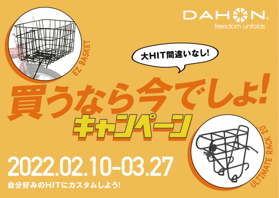 株式会社アキボウ(本社:大阪府堺市 代表取締役社長:西木 一彦)は、NEWエントリーモデルとしてDAHONのラインナップに登場した「HIT」をお買い求めの方限定で、フロントバスケットのEZ BasketとリアラックのUltimate Rack 20"を特別価格でご購入いただけるキャンペーン「大HIT間違いなし!買うなら今でしょ!キャンペーン」を実施いたします。