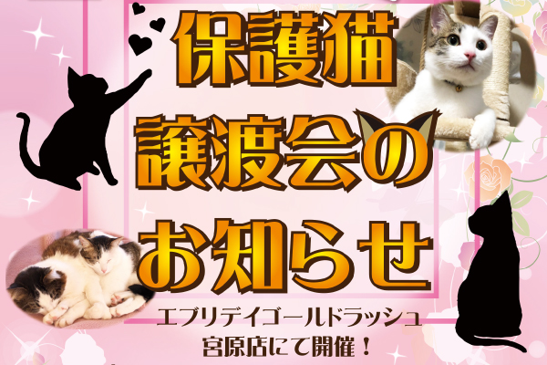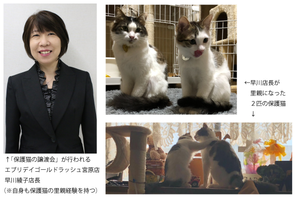 こちらの、当社の空きスペースの活用で初開催となる、今回の『保護猫の譲渡会』が行われるエブリデイゴールドラッシュ宮原店の店長・早川綾子も、数年前に、「保護した猫を助けるために、自身の大切にされていた物を売りに来られた」というお客様に出逢い、強く感銘を受け、自身も何か出来ることはないかと思い、少しでも多くの命を守りたいという想いから、これまでに2匹の保護猫の里親になって、現在、家族の一員に迎え入れております。