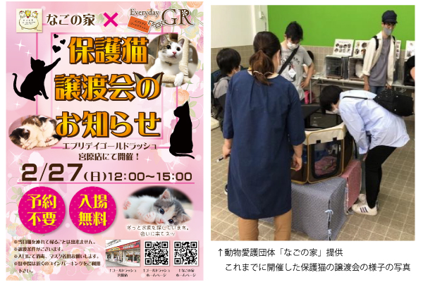 この度、こちらの、開放した当社店舗内の空きスペースを利用した、初の地域交流として、2022年2月27日(日)、埼玉県の動物愛護団体『なごの家』さん主催の、家族のいない保護猫を新しい次の里親へ繋ぐ場となる、いわゆる『保護猫の譲渡会』が開催されることとなりました。