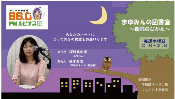 ドリーム放送局・FMルピナス(埼玉県川越市、加藤貴博放送局長)で2月17日、20時30分より21時まで、「まゆみんの図書室~朗読のじかん~」をお届けします。