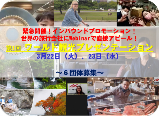 地方自治体のマーケティング支援事業などを展開するクロスボーダー株式会社(本社:東京都台東区、代表取締役グループCEO:古川エドワード英太郎、代表取締役:佐藤 泰也)は、訪日関連事業を主力事業とするアヤベックス株式会社(本社:京都府綾部市、代表取締役:佐々木 崇人)と共同で、都道府県市町村観光部署、観光団体、DMO(観光地域づくり法人)などが発表者となる「第1回 ワールド観光プレゼンテーション」を3月22、23の両日、Webinar(ウェビナー:オンラインセミナー)方式で開催することを緊急決定、プレゼンターとなる団体(6枠)の募集を2月10日に開始しました。世界の旅行会社に直接説明するWebinarはこれまでも数多く開催してきていますが、募集型での開催は初めてになります。世界約90カ国、約1000社の旅行会社に対して情報発信ができる強みを生かした企画で、参加することで、次年度のインバウンド・プロモーションの方向性を検討する材料にしてもらいたいと考えています。プレゼンテーションは、逐日通訳が入り、日本語で出来ます。募集は2月28日まで。
