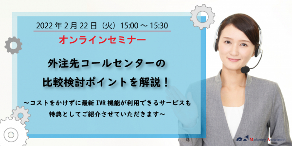 コールセンターサービスを提供しているマーケティングアソシエーション株式会社(本社:東京都台東区 代表取締役:相内あゆ美、以下当社)は、2022年2月22日(火)に、ウェビナー「外注先コールセンターの比較検討ポイントを解説!~コストをかけずに最新IVR機能が利用できるサービスも特典としてご紹介させていただきます~」を開催いたします。