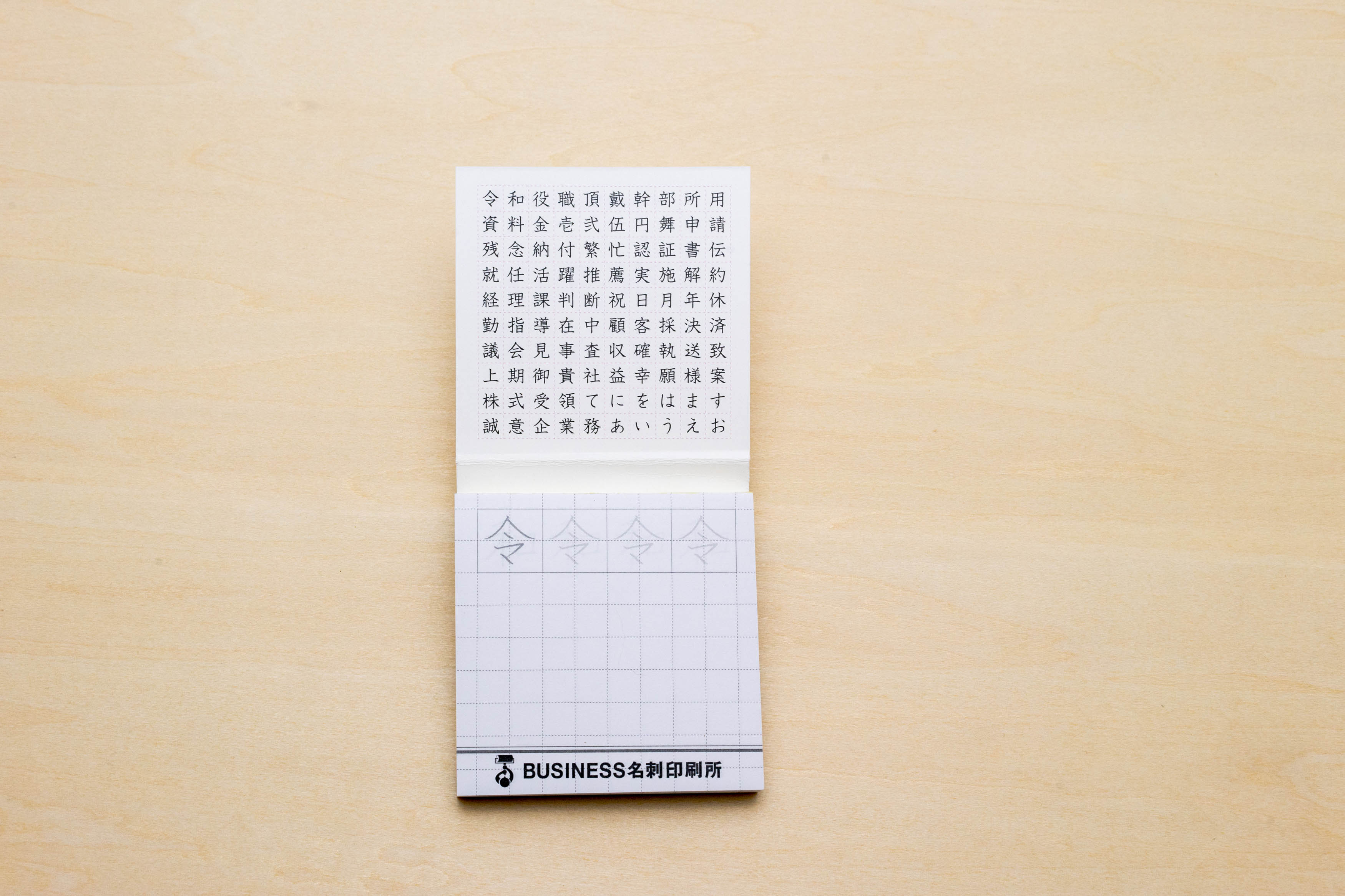 「ペン字書き方メモ帳」は令和2年10月に名刺販売サイトのビジネス名刺印刷所よりノベルティ向け商品として発売し、発売後すぐに意匠登録願を特許庁に出願いたしました。