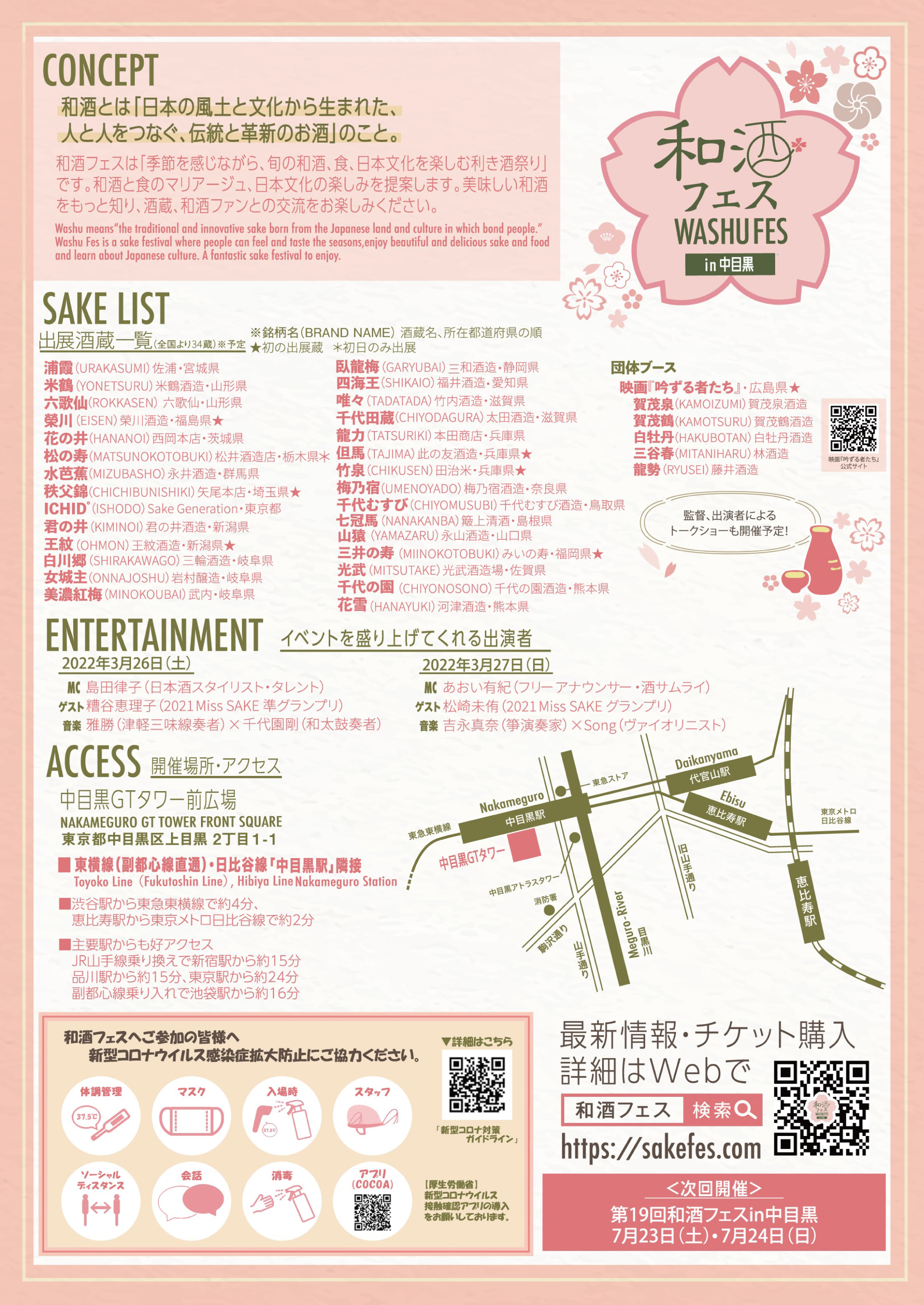 地方創生を応援する和酒フェス実行委員会は、『第18回 和酒フェス in 中目黒』を東京メトロ日比谷線と東急東横線(東京メトロ副都心線直通)の中目黒駅に直結する中目黒GTタワー前広場(東京都目黒区)で、3月26日(土)と27日(日)に、第1部は12時00分から14時15分、第2部は15時00分から17時15分の時間で、3年ぶりに開催いたします。