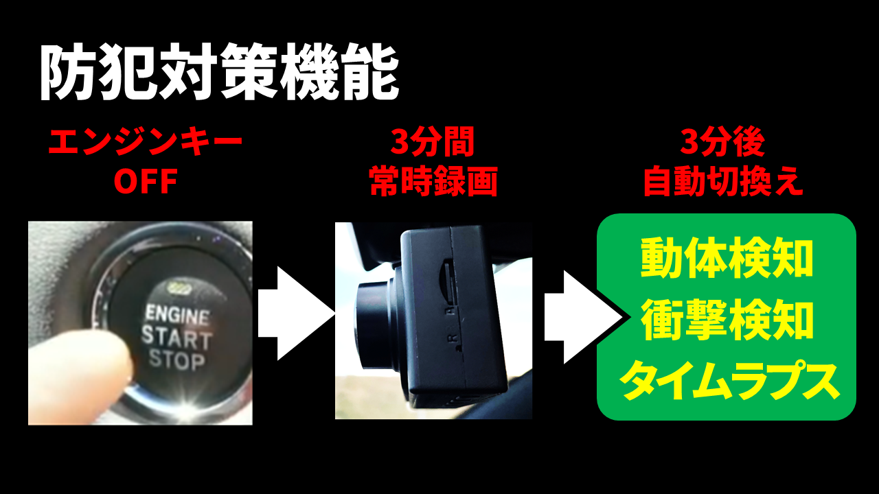 イラズラ、当て逃げなど大切な車への防犯対策機能のご紹介です。エンジンをオフにしたあと約3分間はドライブレコーダーの常時録画(上書き保存)を行います。3分後に予め設定された防犯採択撮影モードに自動的に切り替わります。本体側の画面で電源供給をオフにするタイマーを設定することができます。市販品にはクルマの裏側に配線してあるケーブルのコントロールボックスの小さなディップスイッチを変更しなければなりませんが、GoSafe 490GMなら本体側で手軽に操作可能です。
