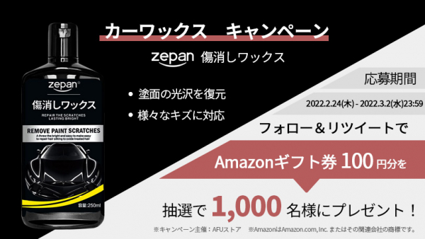 Amazonで販売中のzepan傷消しワックスについて、2022年2月24日12:00よりAFUストアのTwitter公式アカウントで、Amazonギフト券100円分が1000名様に抽選で当たる「カーワックスキャンペーン」を開催しました。