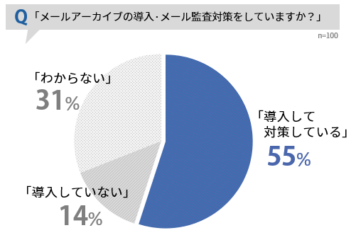 調査対象となる情報システム担当者に、メールアーカイブ導入の有無について質問したところ、過半数の55%が「導入して対策している」との回答でした。現代のビジネスにおいて、メールの保存は不可欠になってきていることが分かります。