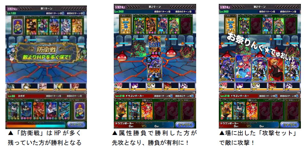 デュエルマッチは、3ターンで1戦が完結し、1vs1で遊べるリアルタイム対人バトルです。バトルには「殲滅戦」「防衛戦」「争奪戦」と3種類のルールがあり、本戦では開催回ごとに、特効スキルとバトルの種類が変わります。
