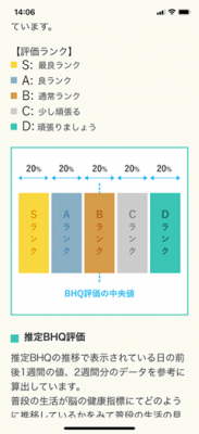 本機能は、アプリ内に日々記録される、アプリユーザー個人の歩行数や食事内容・脳トレーニング結果といったデータをもとに、S~Dの5段階で推定BHQを測定できる機能です。